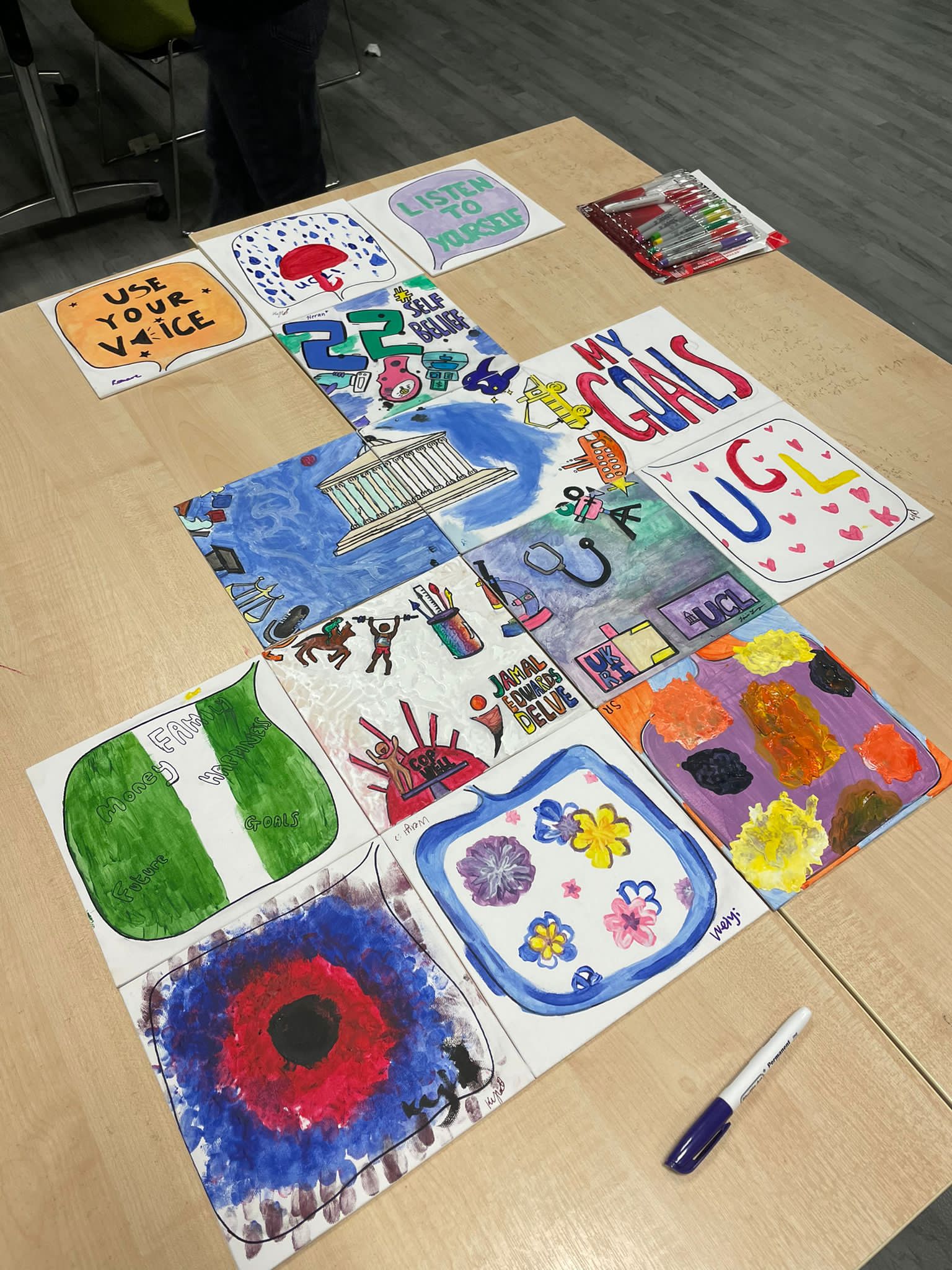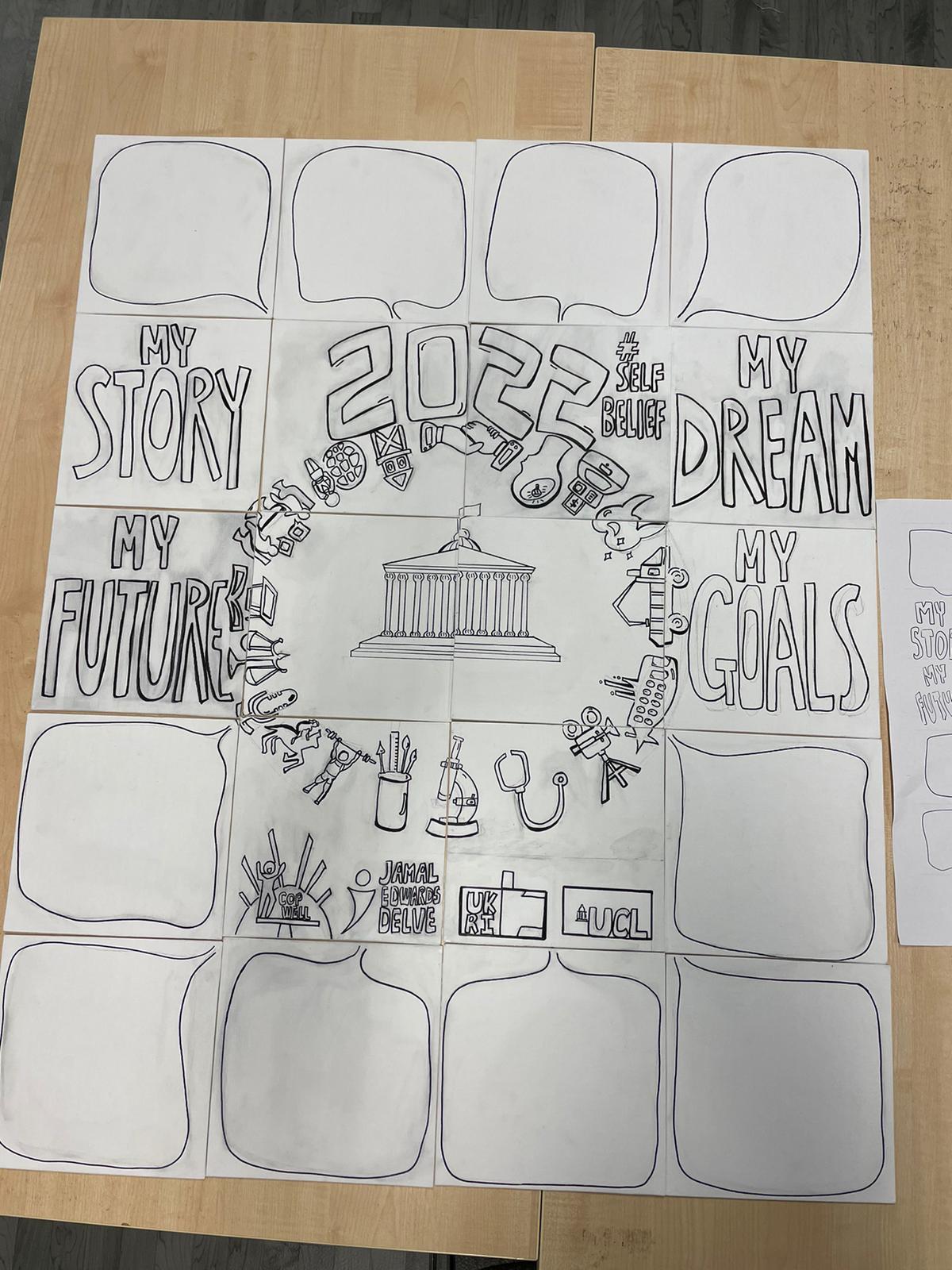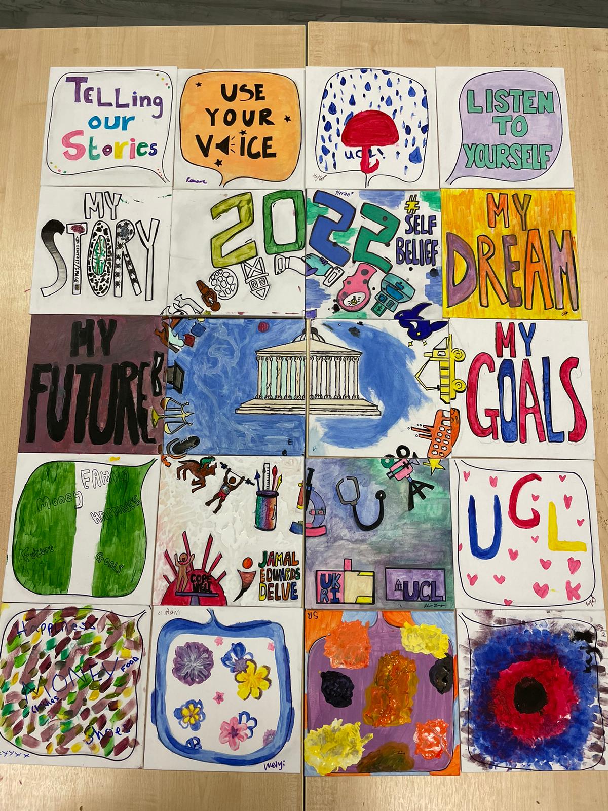 The collaborative artwork made in this collaboration is an integration of 20 individual canvases, with some canvases including provided images while some are blank spaces for reflection. The incorporation of both free-style reflective space and guidelines symbolises the programme’s goal: Through our guidance, we hope that these young people have turned what they have seen and experienced into their own unique goals. We hope that they have learnt how powerful they could be and may their dreams guide them into a bright future of their choices.